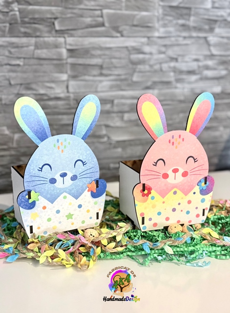 Cutie Iepuras cu model pentru fata sau pentru baiat. Se personalizeaza cu UN SINGUR nume in partea de jos a cutiei.